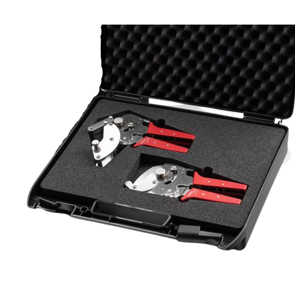The standard toolset includes ratchet scissors and locking pliers, while the premium set features rustproof, anodized aluminium handles.